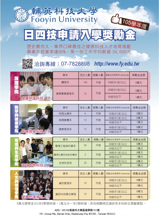 歡迎參考:輔英科技大學日間部日四技申請入學獎勵金招生宣傳