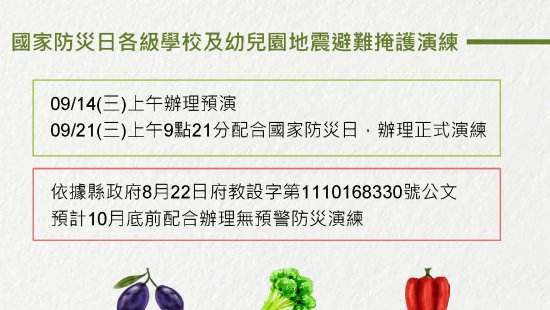 一、依據行政院「111 年國家防災日推動綱要計畫」、教育部 111 年 7 月 14 日「111 年度國家防災日各級學校及幼兒園地震避難掩護演練實施計畫研商會議」決議事項及教育部 111 年 8 月 3 日臺教資(六)字第 1112702869 號函辦理。