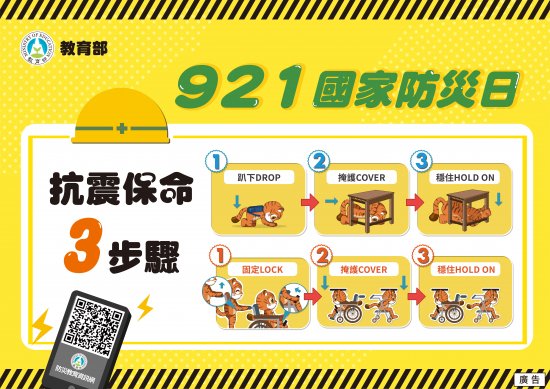 113 年國家防災日訂於 9 月 20 日(星期五)上午 9 時 21 分辦理,全國高級中等以下學校應至少完成實施計畫之「趴下、掩護、穩住」抗震保命三步驟演練。