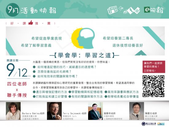 交通大學「學會學:學習之道」磨課師課程於9月12日(二) 開課,通過課程可取得 18 小時教師研習時數,敬請惠予 公告並鼓勵師生踴躍報名,請查照。