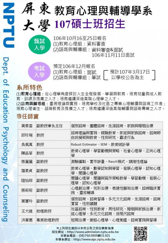 國立屏東大學教育心理與輔導學系107學年度碩士班教育心理組甄試入學招生