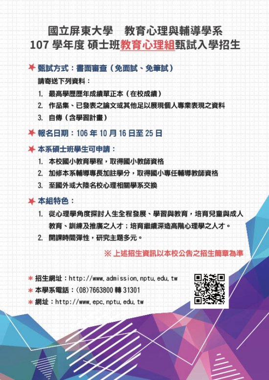 隨文附上國立屏東大學教育心理與輔導學系 107 學年度碩士班教育心理組甄試入學招生海報,敬請有興趣的老師報名參加。
