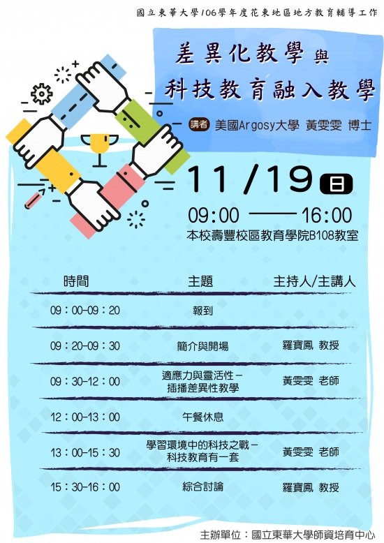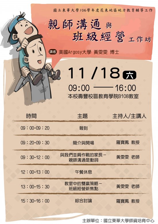 有關東華大學辦理「親師溝通與班級經營工作坊」、「差異化教學與科技教育融入工作坊」活動乙案,敬請有興趣的教職員自行報名參與。