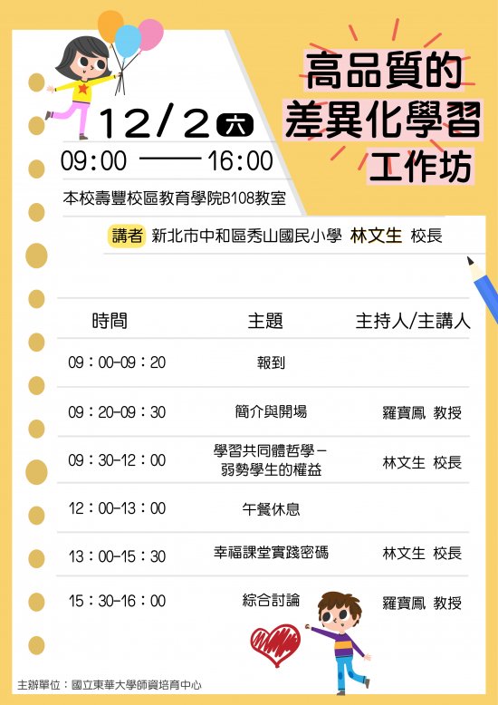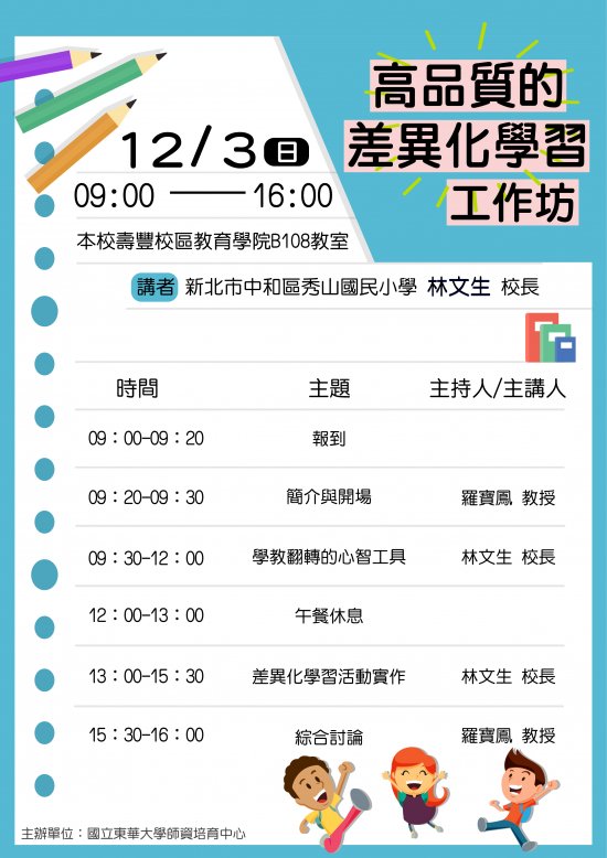 東華大學教育與潛能開發學系羅寶鳳教授辦理「高品質的差異化學習工作坊」活動宣傳海報,鼓勵所屬教師踴躍報名參加