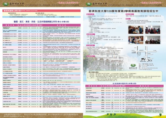 主旨:檢送慈濟科技大學 106 學年度第 2 學期推廣教育招生簡章,鼓勵 貴校師生踴躍參加。 說明: 一、如需獲知詳細之招生訊息及報名表可至本校進修推廣部網頁查詢或下載。 二、網址: http://linuxweb.tcust.edu.tw/tcust/service/。